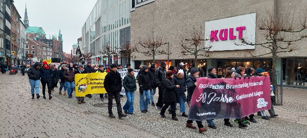 Vor 30 Jahren, am 18. Januar 1996, erschütterte ein Brandanschlag auf ein Asylbewerberwohnheim in der Lübecker Hafenstraße die Stadt Lübeck und die gesamte Bundesrepublik. Zehn Menschen verloren dabei ihr Leben, darunter sieben Kinder. Aus dem Grund fand am 17. Januar eine Trauermarsch durch die Lübecker Innenstadt statt.Etwa 300-400 skandierende Teilnehmer liefen durch die Innenstadt und skandierten mit Lautsprechern ihren Unmut heraus, dass der furchtbare Anschlag mit 10 Mordopfern bisher noch nicht aufgeklärt worden ist.