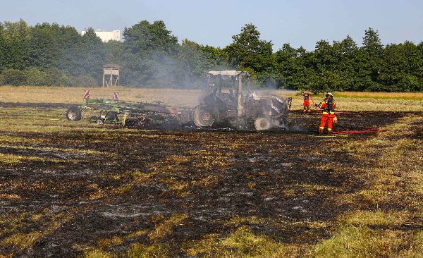 Alarmiert wurde zunächst die Berufsfeuerwehr Neumünster, da der Brand auf einem Feld mit unklarer Wasserversorgung und bereits bei der Anfahrt eine große Rauchwolke zu sehen war, wurde entschieden, den Löschzug Wasser zu alarmieren, bestehend aus den Freiwilligen Feuerwehren Einfeld, Stadt Mitte, Tungendorf und Tungendorf Stadt und Gadeland, die zum Einsatzort fuhren. Sie konnten das Feuer schnell löschen, sodass es nicht zu einem ausgedehnten Flächenbrand kam, der bei den aktuellen Temperaturen und der Trockenheit ungeahnte Ausmaße hätte annehmen können. Vor Ort waren ca. 50 Einsatzkräfte, es brannten ca. 1000 Quadratmeter Feld und an dem Traktor sowie an dem Heuwender entstand ein Totalschaden. Zum Löschen nutzten die Einsatzkräfte das Wasser aus den Tanklöschfahrzeugen. Außerdem war das DRK für die Versorgung der Einsatzkräfte mit ausreichend Flüssigkeit vor Ort. Die Ursache des Feuers, sowie die Schadenshöhe wird noch ermittelt, verletzt wurde niemand, wobei der Fahrer des Traktors noch vergeblich versucht hatte den Brand selbst zu löschen.