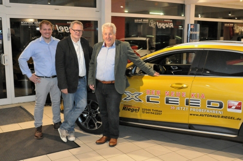 Der Juniorchef Markus Riegel (links) und der Autoverkäufer Thomas Martens (rechts), vom Autohaus Riegel ließen sich mit Ulli Potofski (Bildmitte) und dem neuen KIA XCEED fotografieren. Potofski: „Na da wird mein Mercedes-Händler sich aber freuen.“
