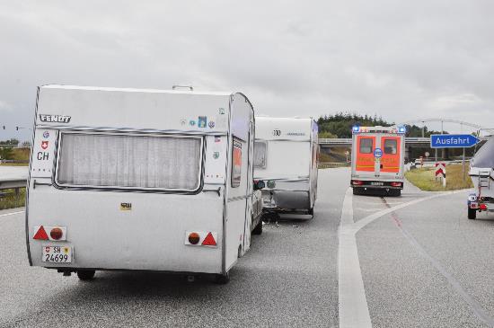 Text und Fotos: TBF/Holger Kröger – Am Sonntagmittag gegen 13:30 Uhr kam es zu einem ungewöhnlichen Unfall auf der A20: Ein Pkw mit Wohnwagen fuhr auf der A20 in Fahrtrichtung Lübeck. Direkt an der Ausfahrt Lübeck-Blankensee kam ein anderer Pkw, ebenfalls mit einem Wohnwagen an der Anhängerkupplung, angefahren und fuhr ungebremst, direkt in den vor ihm fahrenden Wohnwagen hinein. Eine Person wurde dabei verletzt.
