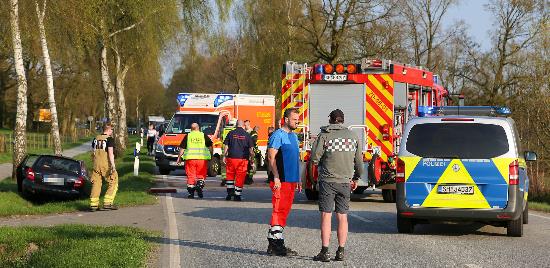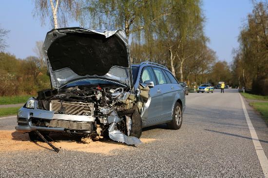 Unfall auf der B206: Ort: B206 zwischen Bad Bramstedt und A7 · Zeit: 22.04.2018, 17:45 Uhr · Fotos: Maria Nyfeler · Text: Maria Nyfeler · Schwerer Unfall am Sonntagabend –Rettungshubschrauber und zwei Schwerverletzte · Bad Bramstedt/B206 – (Maria Nyfeler) Am Sonntagabend gegen 17:45 Uhr ereignete sich auf der B206 zwischen Bad Bramstedt und der A7 ein schwerer Unfall. Zwei PKWs stießen frontal zusammen, ein Skoda aus dem Kreis Segeberg kam im Graben zwischen Straße und Radweg zum Stehen, ein Mercedes aus Lübeck stand völlig verbeult auf der Straße.