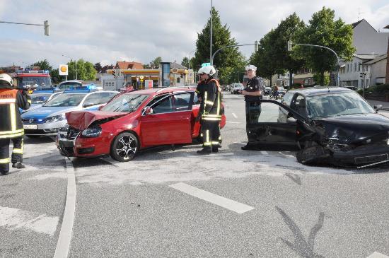 Fotos: TBF/Holger Kröger – Zu einem Unfall mit mehreren Verletzten, vermutlich verursacht durch einen 61-jährigen Mann, kam es am Sonnabendvormittag in der Kronsforder Allee, bei dem ein Hund verstarb. Der Mann übersah gegen 9.45 Uhr mit seinem Fiat Punto beim Abbiegen in die Berliner Straße einen entgegenkommenden Golf, es kam zum Frontalzusammenstoß auf der Berliner Straße. >>>Bildergalerie Seite >>>Die 43-jährige Fahrerin des Golf konnte nicht mehr ausweichen und prallte mit ihrem Wagen frontal gegen den Wagen des 61-Jährigen. Beide Fahrer wurden verletzt und in ein Krankenhaus gebracht.