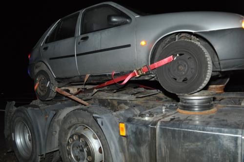 Text: hanseatic news – Fotos: TBF/Holger Kröger – Lübeck- Als einer Streifenwagenbesatzung dieser Lkw auffällt wurde der Fahrer samt Gespann kontrolliert. Ungewöhnlich war nicht die Ladung sondern die Art und Weise wie die Ladung verstaut wurde. Normalerweise ist an dieser Stelle ein Trailer angekuppelt. In diesem Fall wurde ein Ford Fiesta direkt auf das Heck des Lkw geladen. Auf Stahlfelgen und ordentlich festgezurrt hatten die Beamten keine Mängel feststellen können. Nach der Kontrolle konnte der Lkw-Fahrer seine Reise fortsetzen.