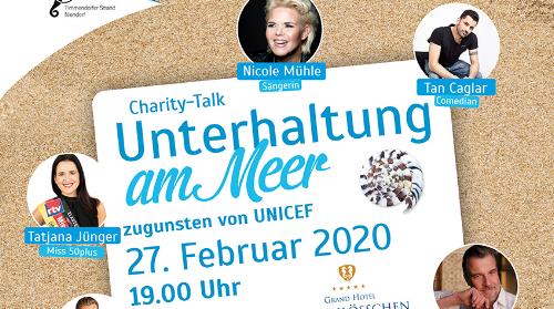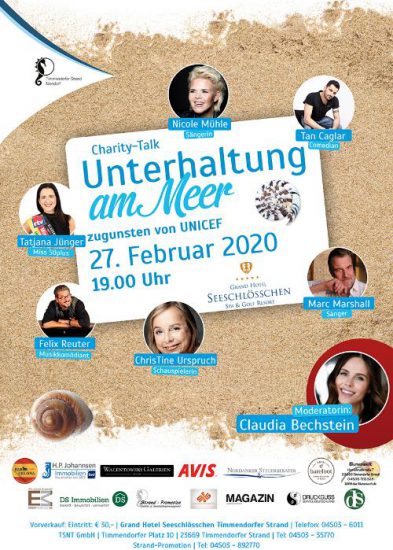 UNICEF Benefiz-Talk-Show ‚Unterhaltung am Meer’, Grand Hotel Seeschlösschen Timmendorfer Strand zu Gunsten von UNICEF-Gemeinsam für Kinder. Das hochkarätige Timmendorfer Life – Entertainment „Unterhaltung am Meer“ im Grand Hotel Seeschlösschen wird von unserer beliebten Event & Gala-Moderatorin Claudia Bechstein moderiert und startet am 27.Februar 2020 in eine neue Runde.Alle sind dabei und zeigen Herz für UNICEF und für Kinder: Stars, prominente Künstler und interessante Talkgäste kommen am Donnerstag, den 27.Februar 2020 an die Ostsee.