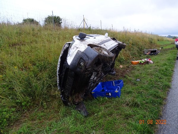 Der Citroen Jumpy überschlug sich und blieb schließlich auf der rechten Seite in der Böschung neben der Fahrbahn liegen.