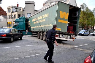 Dieser kam aus Bad Schwartau und wollte in die Marienstrasse einbiegen. Dabei verkeilte sich der Aufleger. Der Verkehr musste einspurig an den verkeilten Aufleger vorbeigeführt werden. Es dauerte ca. eine halbe Stunde, bis der Lkw-Fahrer seine Fahrt, nachdem er die Ladung erneut festgespannt hatte, fortsezten konnte.