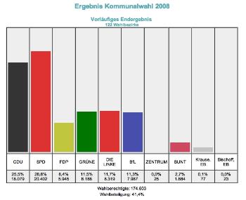 In den nächsten 5 Jahren sieht es in der Lübecker Bürgerschaft recht bunt aus: Es wurde in122 Wahlbezirken gewählt, SPD und CDU sind die Hauptverlierer, wobei die CDU die absolute Mehrheit verlor. Drei neue Gruppierungen ziehen in Lübecks Bürgerschaft ein. Mehrheitsfraktion CDU stürzt dramatisch ab / SPD stagniert/ Linke wird auf Anhieb drittstärkste Fraktion / Zwei neue Wählerinitiativen im Rat / 41,4 Prozent Wahlbeteiligung. Folgende Ergebnisse wurden im Einzelnen erzielt: