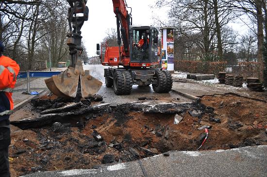 Stadtwerkemitarbeiter und Tiefbaufirma waren bis spät in die Nacht damit beschäftigt, den Rohrbruch in der Krähenstraße zu reparieren, da es z. Zt. wegen des Frostes keinen Asphalt gibt wird die Fläche im Straßenbereich vorläufig gepflastert