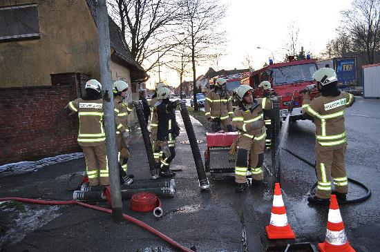Fotos: TBF/Holger Kröger – Passanten sahen aus einem Gebäude des jüdischen Friedhofs an der Niendorfer Straße in Lübeck Wasser aus der Tür auf den Bürgersteig und Fahrradweg laufen.Sie verständigten die Polizei. Die Beamten stellten fest, dass durch Frost und Tauwetter in dem Gebäude im Keller ein Rohr geplatzt war. Der Keller war vollgelaufen. Die freiwillige Feuerwehr Moisling und die Berufsfeuerwehr der Wache 2 waren ca. 3 Stunden im Einsatz und mussten den Kellerraum leerpumpen.