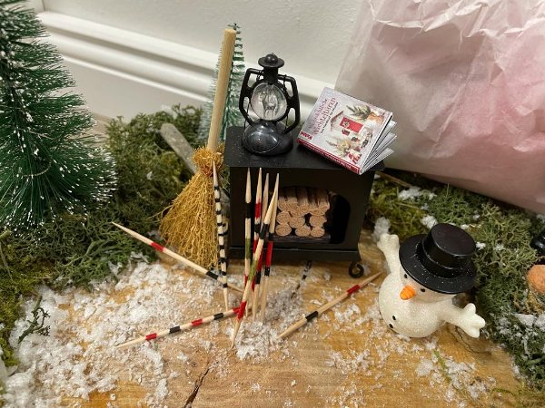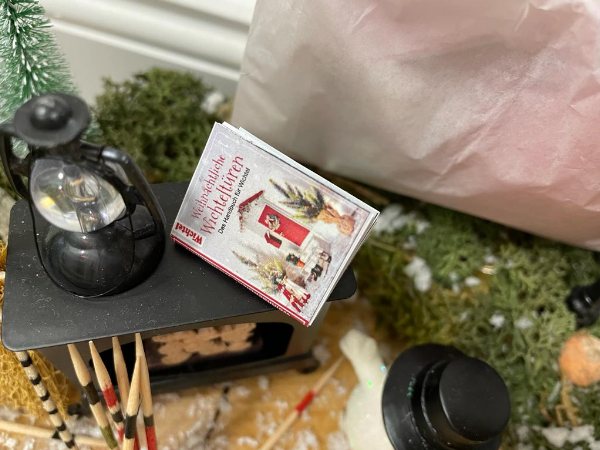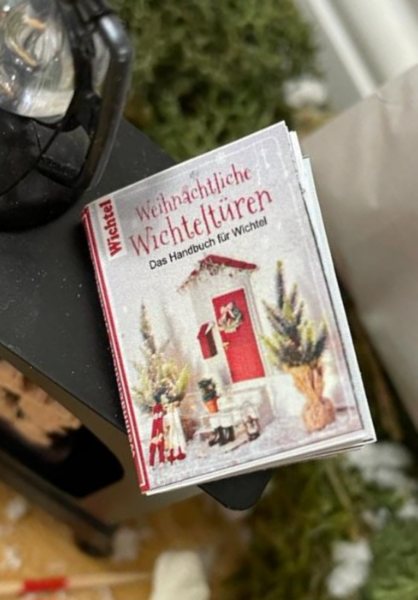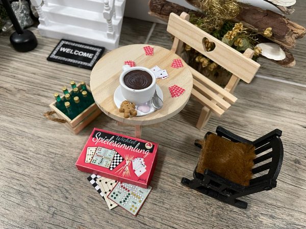 Tomte hat seinen Eltern dann seinen Garten und seine Wohnung gezeigt und auch den Platz wo Sie schlafen können. Anschließend machten Sie einen schönen Spieleabend, mit Wichtel ärgere dich nicht, Mühle, Halma, Mikado und Karten. Schwarzer Peter und Schummel-Lieschen hatten Ihnen besonders viel Spaß gemacht. Dabei kam Tomtes neuer Gartentisch ganz groß zur Geltung. Sie hatten sich so lange nicht gesehen und viel zu erzählen. Tomtes Erkältung war schon fast wieder abgeklungen, trotzdem hat Mama dem Kleinen noch einen Tee gemacht, ach Sie hatte Ihren Liebling so vermisst. Als kleines Mitbringsel gab es für Tomte von seinen Eltern noch ein Buch über Wichtel Wohnungstüren und Wohnungseinrichtungen. Das fand der kleine Wichtel richtig interessant.