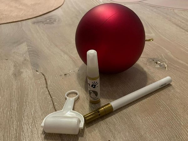 In dem Päckchen von Asmo und Swea war eine wunderschöne rote Weihnachtsbaumkugel, direkt vom Nordpol. Das war eine tolle Idee von Tomte’s Eltern. Die Kugel kann Nike mit ihren Händeabdrücken und ihrem Namen verzieren. Ihren Namen schreiben hatte Nike mit Mama schon geübt.
