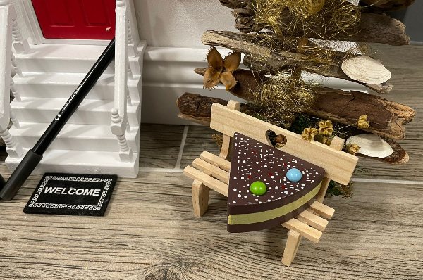 Streiche kann Tomte aber ganz gut. Nachts hat er sich mit einem Stift ins Schlafzimmer geschlichen und die Gesichter von Nike und ihren Papa angemalt. Den Stift hatte Tomte sich schon auf der Treppe vor seiner Wohnungstür bereitgelegt. Den Schokoladenkuchen aus Holz hat er auf seiner Gartenbank abgelegt.
