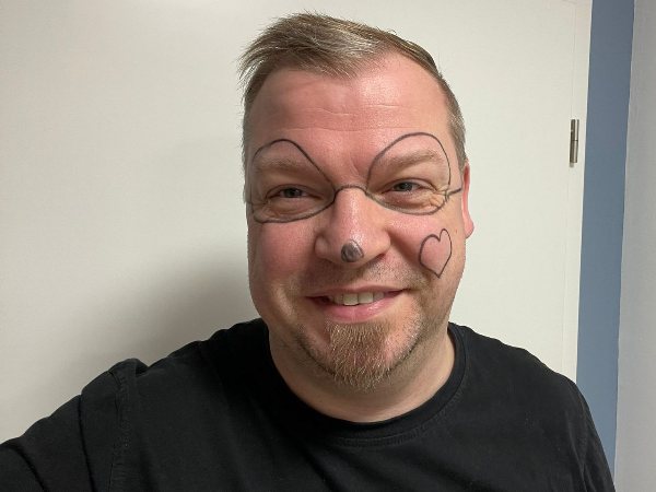 Nike’s Papa schaute morgens in den Spiegel und dachte heute ist Karneval. Nike selbst hatte ihr Gesicht schon gewaschen als Mama mit dem Fotoapparat ankam, aber den Papa hat Sie noch erwischt. Der sagte nur: „Sehr lustig“. Er guckte aber gar nicht so, eher wie drei Tage Regenwetter.