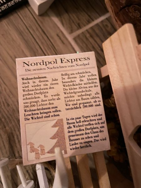 Tomte war die ganze letzte Nacht unterwegs. Stellt euch vor, die Verpackungsmaschine bei den Wichteln am Nordpol ist ausgefallen, weil eine Zuckerstange reingefallen war. Alle Wichtel mussten schnell kommen und helfen Weihnachtsgeschenke zu verpacken. Es stand sogar im Nordpol Express. Tomte hat die aktuelle Ausgabe mit nach Hause gebracht. Wichtige Meldung und Hauptschlagzeile, ZAUBERPULVER VERTAUSCHT!!! Fehler beim Zauberpulver abfüllen. Die Rentiere die immer den Weihnachtsschlitten ziehen, haben statt Flugpulver Schrumpfpulver gefressen und wurden ganz klein. Sie mussten erstmal mit einer Lupe gesucht werden, um sie dann wieder auf die richtige Größe zurück zu bekommen. Nach seiner Rückkehr am frühen Morgen hat der kleine Kerl dann noch ausgenutzt, daß es endlich geschneit hat und hat draußen noch ein paar Runden mit seinen Skiern gedreht.