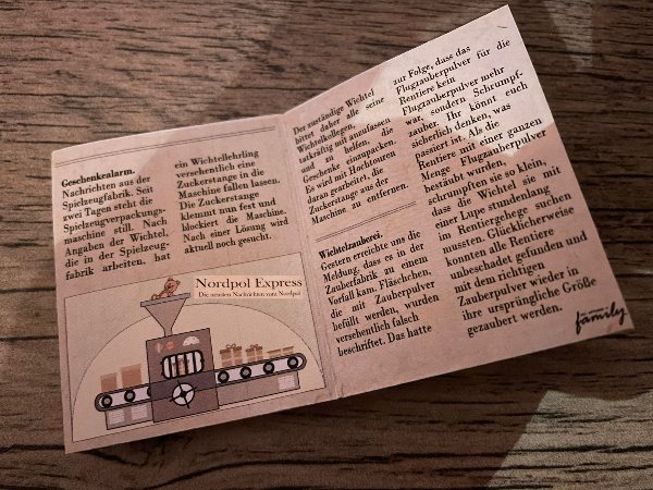Tomte war die ganze letzte Nacht unterwegs. Stellt euch vor, die Verpackungsmaschine bei den Wichteln am Nordpol ist ausgefallen, weil eine Zuckerstange reingefallen war. Alle Wichtel mussten schnell kommen und helfen Weihnachtsgeschenke zu verpacken. Es stand sogar im Nordpol Express. Tomte hat die aktuelle Ausgabe mit nach Hause gebracht. Wichtige Meldung und Hauptschlagzeile, ZAUBERPULVER VERTAUSCHT!!! Fehler beim Zauberpulver abfüllen. Die Rentiere die immer den Weihnachtsschlitten ziehen, haben statt Flugpulver Schrumpfpulver gefressen und wurden ganz klein. Sie mussten erstmal mit einer Lupe gesucht werden, um sie dann wieder auf die richtige Größe zurück zu bekommen. Nach seiner Rückkehr am frühen Morgen hat der kleine Kerl dann noch ausgenutzt, daß es endlich geschneit hat und hat draußen noch ein paar Runden mit seinen Skiern gedreht.