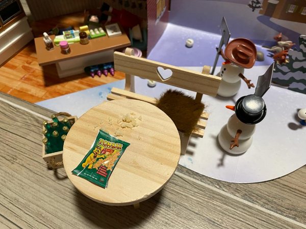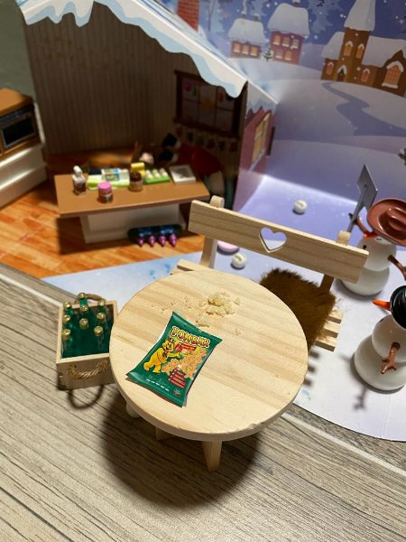 Die zwei haben Tomtes Bank und Tisch ins Wohnzimmer getragen und die Winterkulisse von Nikes Playmobil-Adventskalender zurechtgerückt, damit sie sich ein bisschen wie zuhause am Nordpol fühlen. Nun fehlten nur noch die leckeren Pommbär-Chips mit Ketchup Geschmack. Tomte und Nisse hatten eine schöne Nacht.