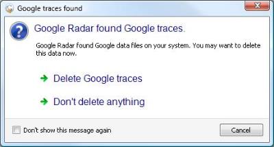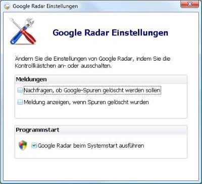 Machen Sie es sich einfach und lassen Sie das Google Radar Ihren Computer überwachen. Das Google Radar läuft unauffällig im Hintergrund und löscht regelmäßig Google-Spuren, Cookies und Datenmüll von Ihrem Computer. Bequemer geht es nicht.