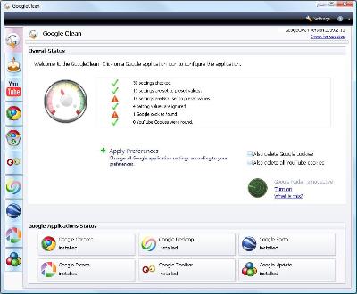 Die Bedienung von GoogleClean ist wie gewohnt einfach. Schnell wird anhand eindeutiger Symbole ersichtlich, wie sicher die Google-Anwendungen auf dem Rechner eingestellt sind, welche Sicherheitsoptionen angepasst werden sollen und ob Daten bereinigt werden können. Die Funktionen von GoogleClean lassen sich über wenige Mausklicks erreichen. Wer es detailliert liebt, kann in diversen Untermenüs ganz gezielt die Einstellungen einzelner Google-Anwendungen verändern.