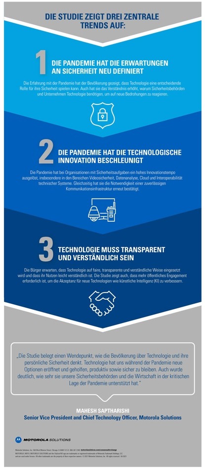 88 Prozent der Befragten weltweit wünschen sich eine Veränderung der öffentlichen Sicherheit durch den Einsatz moderner Technologien. Dem stimmt auch die Mehrheit der Befragten in Deutschland zu (ebenfalls 88 Prozent). Die Studie zeigt, dass Bürger von öffentlicher Sicherheit mehr erwarten als zuvor und gleichzeitig dem Einsatz neuer Technologien offen gegenüberstehen. Die Studie identifiziert drei zentrale Trends: 1. Die Pandemie hat die Erwartungen an die Sicherheit neu definiert. Die Erfahrung mit der Pandemie hat der Bevölkerung gezeigt, dass Technologie eine entscheidende Rolle für ihre Sicherheit spielen kann. Auch hat sie das Verständnis erhöht, warum Sicherheitsbehörden und Unternehmen Technologie benötigen, um auf neue Bedrohungen zu reagieren. 2. Die Pandemie hat technologische Innovationen beschleunigt. Die Studie verdeutlicht, dass die Pandemie bei Behörden und Organisationen mit Sicherheitsaufgaben aber auch bei Unternehmen ein hohes Innovationstempo ausgelöst hat. Dies zeigt sich insbesondere beim Einsatz von Videolösungen, im Bereich Cloud sowie beim Thema Interoperabilität verschiedener Technologien. Gleichzeitig wurde die Notwendigkeit einer zuverlässigen und ausfallsicheren Kommunikation bestätigt. 3. Technologie muss fair und transparent eingesetzt werden. Die Studie unterstreicht die Bedeutung von Transparenz und Vertrauen, um die öffentliche Unterstützung für den Einsatz von Technologien sicherzustellen. Bürger fordern, dass die Technologie auf transparente Weise genutzt wird: Für 82 Prozent der weltweit Befragten ist Datenschutz wichtig. 75 Prozent der Bevölkerung (71 Prozent in Deutschland) geben an, dass sie Sicherheitsbehörden bei der Nutzung ihrer Daten vertrauen – sofern sie wissen, wie diese eingesetzt werden. Die vollständige Meldung finden Sie hier (https://newsroom.motorolasolutions.com/news/weltweite-studie-corona-pandemie-hat-die-akzeptanz-f%C3%BCr-den-einsatz-neuer-technologien-bei-sicherheitsbeh%C3%B6rden-und-unternehmen-erh%C3%B6ht.htm). Den gesamten Report finden Sie hier (https://www.motorolasolutions.com/en_us/consensusforchange.html). Pressekontakt: Pressekontakt Susanne Stier Motorola Solutions Mobile: +49 (0)172 6161773 Susanne.Stier@motorolasolutions.com Original-Content von: Motorola Solutions, übermittelt durch news aktuell