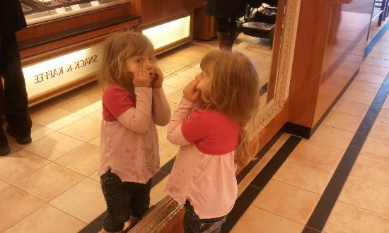 Foto: TBF/Wolfgang Freywald – Neulich war ich wieder einmal bei Bäckerei Junge in der Breiten Strasse. Nach dem tollen Frühstück wollte ich in die fussgängerzone und kam an dem grossen Spiegel vorbei, der gegenüber des Tresens montiert ist und da war ein kleiunes Mädchen (4) und entdeckte die Welt und auch sich und spielte völlig unbefangen mit sich selbst.