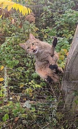 Das Tier wurde zuvor von Jäger Jan Haberkamm in höchster Not entdeckt. Er fand die Katze fest verknotet in einem Zaun hängend. Sie konnte sich nicht aus eigener Kraft befreien. Der Jäger schnitt die Katze frei und rettete ihr damit das Leben. Anschließend sammelte er Haare ab, die das Tier am Zaun hinterlassen hatte und das LfU ließ die Haare beim Institut Senckenberg in Gelnhausen genetisch analysieren. Das Ergebnis ist eindeutig: eine Europäische Wildkatze. Viele Wildtiere verenden qualvoll an Knotengeflechtzäunen. Der BUND setzt sich seit Jahren dafür ein, diese Zäune abzubauen und durch sichere Alternativen aus Holz zu ersetzen.