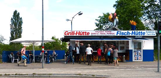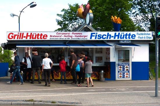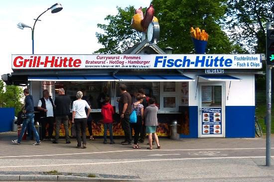 Willkommen in der „neuen’“ Fischhütte in Lübeck direkt am Kreisverkehr Lindenplatz, ganz in der Nähe des Bahnhofs. Auch die Telefonnummer hat sich geändert: 0451-861629 · Am früheren Standort der Fischhütte, direkt an der Drehbrücke, standen nach dem Krieg diverse Buden und Stände, an denen auch frischer Fisch verkauft wurde. Um 1955 wurde dort ein Kiosk gebaut, der Zeitungen, Zigaretten, Bier und Eis anbot. Diesen Kiosk kaufte Ahlerich Djuren und er machte einen Imbiss aus dem Kiosk. So entstand der Imbiss an der Drehbrücke, der nun seit 1968 im Familienbesitz ist. Damals versorgte der Imbiss die Hafenarbeiter mit selbst gekochter Erbsensuppe und Würstchen sowie Getränken. Der Laden hatte auch noch spätabends auf, wenn die Arbeiter von der zweiten Schicht kamen.