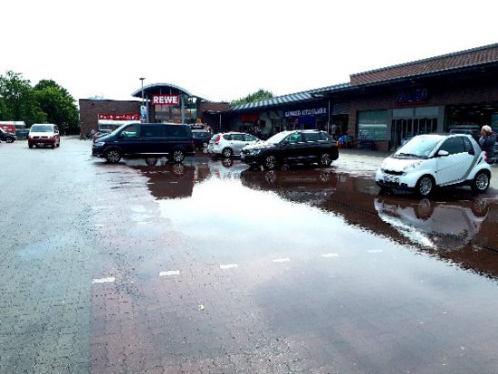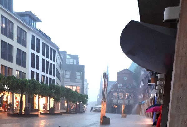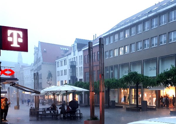 Wolfgang Freywald weiter: „Ich befand mich gerade in der Breiten Strasse, da schüttete es urplötzlich wie aus Eimern und Hagelkörner und Wassermassen prasselten auf den Asphalt. War bisher die Strasse noch voller Menschen, war sie wie aus Geisterhand, plötzlich völlig leer und man sah sie dann unter den Vordächern der Geschäfte und Banken, oder liefen hektisch und sich unter Plastiktüten schützend in die Häusereingänge.“