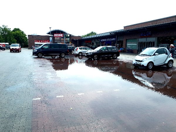 Der Drogerie Markt Rossmann musste vorrübergehend schliessen, weil das Lager voll gelaufen war und auch Wasser im Laden stand, vor die Eingangstür wurden provisorische Einkaufswagen gestellt, um den einlass zu verhindern.
