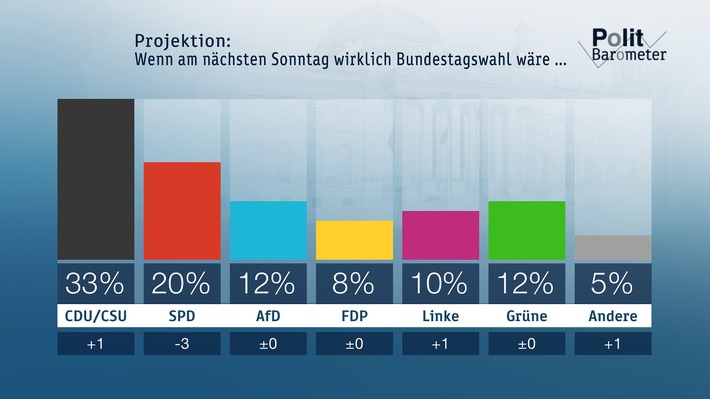 Mainz (ots) – In der Woche vor dem Sonderparteitag der SPD, auf dem es um die Entscheidung für die Aufnahme von Koalitionsverhandlungen mit der CDU/CSU geht, fällt die SPD bei der Projektion auf einen Negativrekord. Projektion Wenn am nächsten Sonntag wirklich gewählt würde, dann käme die CDU/CSU jetzt auf 33 Prozent (plus 1), die SPD nur noch auf 20 Prozent (minus 3). Die AfD erreichte 12 Prozent (unverändert), die FDP 8 Prozent (unverändert), die Linke 10 Prozent (plus 1), und die Grünen erhielten 12 Prozent (unverändert). Die anderen Parteien lägen zusammen bei 5 Prozent (plus 1). Ergebnisse der Sondierungsgespräche Diese dramatisch schlechten Werte für die SPD sind vor dem Hintergrund der durchwachsenen Bewertung der Sondierungsergebnisse mit der CDU und CSU zu sehen. Insgesamt finden diese Ergebnisse 38 Prozent gut und 41 Prozent nicht gut (Rest zu 100 Prozent hier und im Folgenden jeweils „weiß nicht“). Nur die Anhänger der CDU/CSU halten diese mehrheitlich für gut (57 Prozent zu 23 Prozent). Bei den SPD-Anhängern sind die Meinungen eher geteilt (41 Prozent zu 46 Prozent). Bei den Anhängern aller anderen Parteien werden sie mehrheitlich als „nicht gut“ bewertet. Wer hat sich eher durchgesetzt? Nach Meinung der Befragten tragen die erzielten Ergebnisse stärker die Handschrift der CDU als die der SPD: So meinen 63 Prozent, dass die CDU ihre Forderungen dort eher durchgesetzt hat (19 Prozent sehen das nicht so), 50 Prozent sagen das von der CSU (eher nicht: 29 Prozent). Nur 24 Prozent glauben, dass die SPD ihre Forderungen eher durchgesetzt hat (eher nicht: 58 Prozent). Große Koalition Unabhängig von der recht kritischen Sicht auf die Sondierungsergebnisse stößt die Große Koalition eher auf Wohlwollen: 45 Prozent fänden eine gemeinsame Regierung von CDU/CSU und SPD gut, 17 Prozent wäre das egal, und 36 Prozent fänden sie schlecht. Klare Mehrheiten der Anhänger von CDU/CSU (gut: 68 Prozent; schlecht: 17 Prozent) und der SPD (gut: 57 Prozent; schlecht: 29 Prozent) befürworten die GroKo. SPD-Parteitag und Martin Schulz Auf dem SPD-Parteitag am Sonntag in Bonn muss die SPD entscheiden, ob sie auf der Basis der Ergebnisse der Sondierungsgespräche Koalitionsverhandlungen mit der Union aufnehmen will. Eine deutliche Mehrheit (64 Prozent) der Befragten erwartet, dass die SPD dort grünes Licht geben wird, 30 Prozent meinen das nicht. In den Reihen der SPD-Anhänger glauben sogar 75 Prozent, dass sich die SPD für Koalitionsverhandlungen entscheiden wird (glauben nicht: 20 Prozent). Wenn es um die Frage geht, was für die SPD besser wäre, eine Koalition mit der Union oder der Gang in die Opposition, sind sowohl die Gesamtheit aller Befragten als auch die SPD-Anhänger eher geteilter Meinung (46 Prozent zu 48 Prozent bzw. 47 Prozent zu 51 Prozent). Dass Martin Schulz seine Arbeit als SPD-Vorsitzender eher gut macht, glauben 35 Prozent aller Befragten, 55 Prozent sehen das nicht so. Ganz anders fällt das Meinungsbild bei den SPD-Anhängern aus. 66 Prozent finden, dass Martin Schulz seine Arbeit gut macht (nicht gut: 28 Prozent). Neuwahlen? Sollte es nicht zu einer Großen Koalition kommen, plädieren 54 Prozent aller Befragten für Neuwahlen, 43 Prozent sind dann für eine Minderheitsregierung der CDU/CSU. TOP TEN Auf der Liste der nach Meinung der Befragten zehn wichtigsten Politikerinnen und Politiker gibt es relativ wenig Veränderung zum Dezember-Politbarometer: Wolfgang Schäuble liegt weiter auf Platz eins mit einem Durchschnittswert von 1,8 (Dez.: 2,0) auf der Skala von +5 bis -5. Dahinter folgen Winfried Kretschmann mit 1,7 (Dez.: 1,5), Angela Merkel mit unveränderten 1,5 und ebenfalls unverändert mit nur ein paar Hundertstel weniger Sigmar Gabriel mit 1,5. Danach kommen Cem Özdemir mit 1,1 (Dez.: 1,1), Ursula von der Leyen mit 0,5 (Dez.: 0,5), Martin Schulz mit 0,4 (Dez.: 0,6), Sahra Wagenknecht mit 0,4 (Dez.: 0,2) und Christian Lindner mit unveränderten 0,3. Schlusslicht bleibt, wenn auch deutlich verbessert, Horst Seehofer mit 0,0 (Dez.: minus 0,4). Angela Merkel wieder Kanzlerin? Wenn Angela Merkel wieder Kanzlerin wird, fänden das 54 Prozent gut und 42 Prozent nicht gut. Unmittelbar nach der Bundestagswahl lag ihre Unterstützung noch bei 62 Prozent (nicht gut: 35 Prozent). Die Umfrage zum Politbarometer wurde wie immer von der Mannheimer Forschungsgruppe Wahlen durchgeführt. Die Interviews wurden in der Zeit vom 16. bis 18. Januar 2018 bei 1332 zufällig ausgewählten Wahlberechtigten telefonisch erhoben. Dabei werden sowohl Festnetz- als auch Mobilfunknummern berücksichtigt. Die Befragung ist repräsentativ für die wahlberechtigte Bevölkerung in Deutschland. Der Fehlerbereich beträgt bei einem Anteilswert von 40 Prozent rund +/- drei Prozentpunkte und bei einem Anteilswert von 10 Prozent rund +/- zwei Prozentpunkte. Daten zur politischen Stimmung: CDU/CSU: 36 Prozent, SPD: 21 Prozent, AfD: 8 Prozent, FDP: 8 Prozent, Linke: 11 Prozent, Grüne: 12 Prozent. Das nächste Politbarometer sendet das ZDF am Freitag, 2. Februar 2018. Weitere Informationen zur Methodik der Umfrage und zu den genauen Frageformulierungen auf www.forschungsgruppe.de. http://heute.de http://twitter.com/ZDFpresse http://facebook.com/ZDF Ansprechpartner: Presse-Desk, Telefon: 06131 – 70-12108, pressedesk@zdf.de Fotos sind erhältlich über ZDF Presse und Information, Telefon: 06131 – 70-16100, und über https://presseportal.zdf.de/presse/politbarometer Pressekontakt: ZDF Presse und Information Telefon: +49-6131-70-12121 Original-Content von: ZDF, übermittelt durch news aktuell