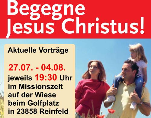 zum Ziel gesetzt, auf dem Rasenplatz, Binnenkamp 28 in Reinfeld, eine Zeltevangelisation unter dem Motto: „Begegne Jesus Christus!“, durchzuführen, die an 9 Abenden, in leicht verständlicher Weise, durch den Redner Rudi Joas, Missionswerk Werner Heukelbach, den Besuchern Gottes Wort, die Bibel, näher bringen möchte.