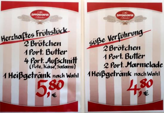 Text: TBF/Wolfgang Freywald · Fotos: TBF/Holger Kasnitz · Frühstück in Lübeck. „Zufalls“-Frühstück bei Bäckerei & Cafè Zippendorfer, Roter Löwe, Lübeck, Moislinger Allee 97. Eigentlich wollten Holger und ich heute nicht in der Moislinger Allee frühstücken, aber ich hatte ein paar Häuser vorher eine Termin. Da fiel mir das ehemalige Cafè ein, daß ca. vor 3 Jahren, genau an der Ecke Luise-Otto-Peters-Straße, von Zippendorfer übernommen wurde und nun bis vorgestern wegen Umbauarbeiten geschlossen hatte.So trafen wir uns heute um 9.30 Uhr dort zum Frühstück. Robert Hermsdorf (33), der neue Bäckerei & Cafè-Leiter empfing uns freundlich und bot uns ein „Herzhaftes-„, oder „Süßes Frühstück“ zu 4,80 €, oder 5,80 € an.