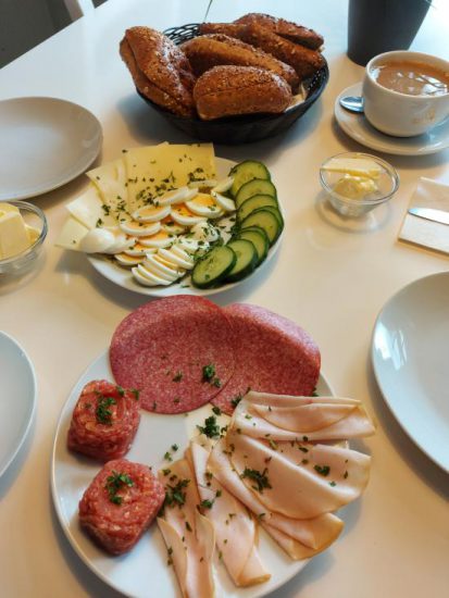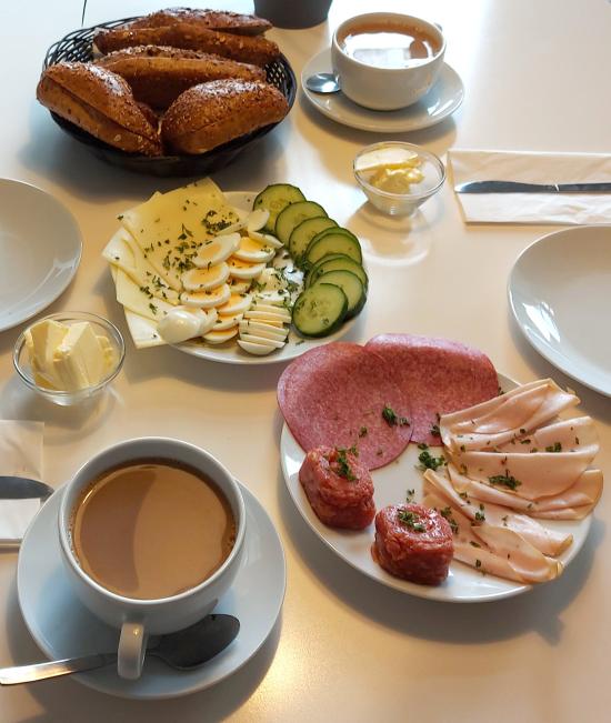 Holger und ich ent-schieden uns für das „Hezhafte“ und hatten die freie Wahl bei Brötchen und 4 Sorten Aufschnitt, nämlich zwischen Pute, Käse, Salami, Mett, Ei, Fleischsalant und Camembert. Dazu gab es Butter, alles nett dekoriert und je einen großen Becher Kaffee für Holger und mich. In Zeiten Corona mussten wir uns auch hier in eine Liste eintragen, die 2- 3 Wochen archiviert und dann entsorgt wird.