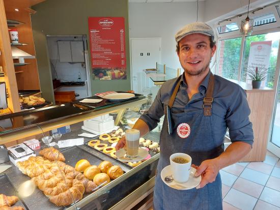 Hatte Robert Hermsdorf als wir kamen, gerade nicht so viel zu tun, füllte sich das Cafè recht schnell und  er hatte nun doch viel zu tun, bis gegen 11 Uhr ein weiterer Mitarbeiter, nämlich Kevin dazu stieß und fleißig mithelfen konnte, um den Andrang abzuarbeiten. Für den gerade mal angefangenen Vormittag und der Tatsache, daß die Bäckerei gestern wieder neu eröffnet worden war, lief alles recht reibungslos ab.
